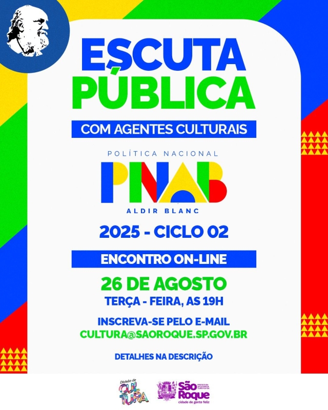 O encontro será on-line, às 19h e para participar é fácil, basta enviar um e-mail para cultura@saoroque.sp.gov.br, com o assunto: "Participação na Escuta Pública PNAB" e as seguintes informações: Nome completo, CPF e telefone.